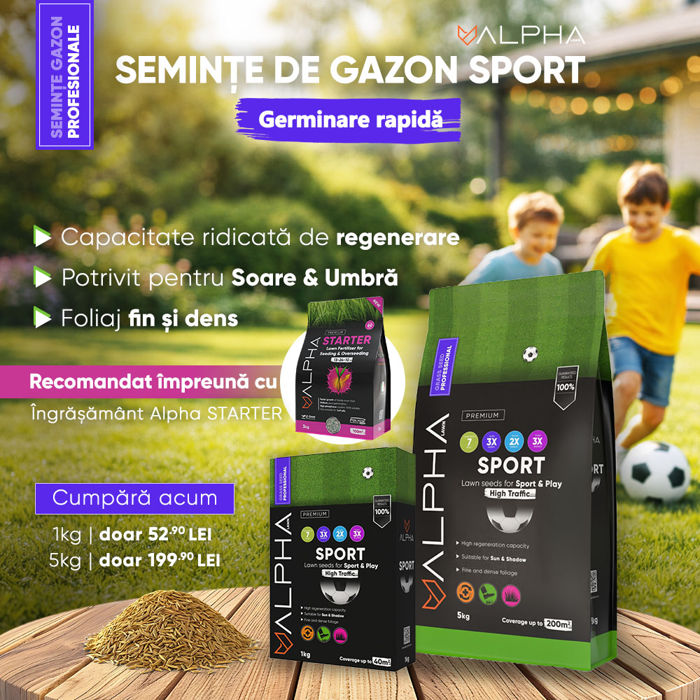 ⚽Alpha SPORT - (⭐recomandat) Obține un gazon de calitate superioară, perfect pentru terenuri de joaca și zone cu trafic intens, cu ajutorul semințelor noastre de gazon sport. Formulată cu o combinație atent aleasă de Festuca Rubra, Poa Pratensis și Lolium Perene, această amestecă asigură un gazon rezistent, cu o creștere rapidă și o uniformitate excelentă. Disponibile la ambalaj de 1kg si 5kg.